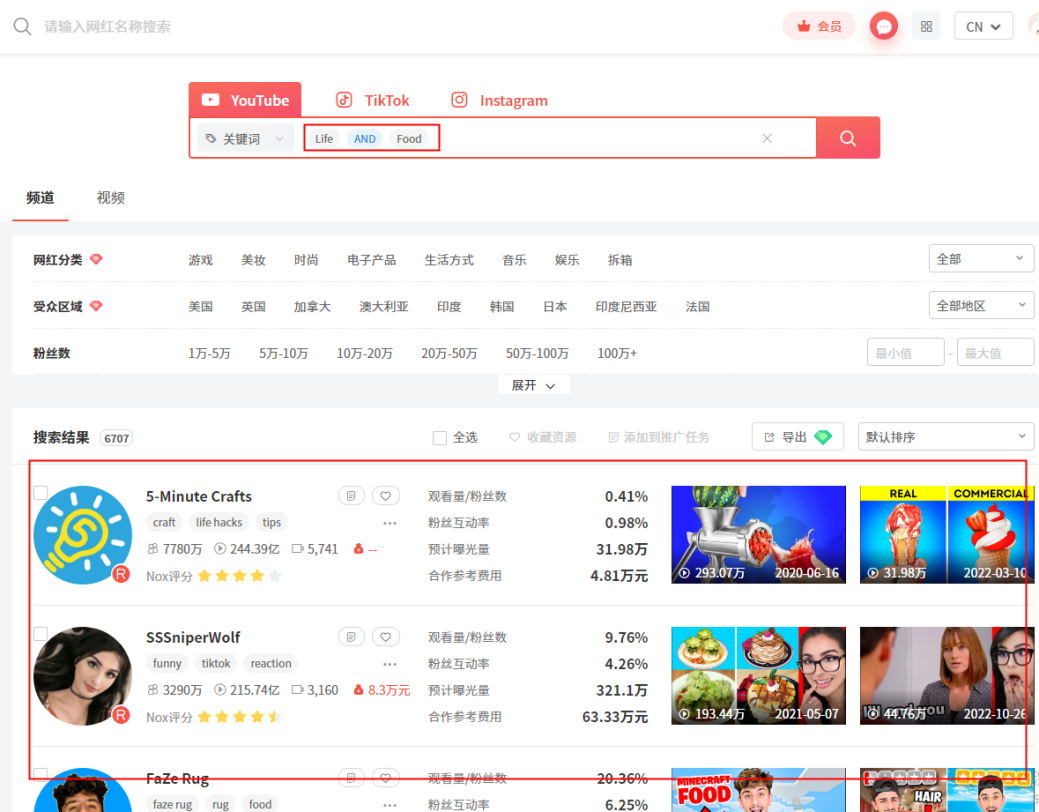 截至目前,Nox聚星支持YouTube、Instagram、TikTok三个平台的关键词搜索。