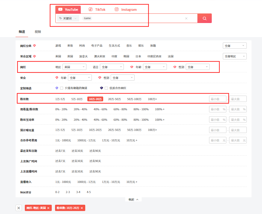 示例:若广告主想要找美国地区,粉丝数为10-20万之间的YouTube游戏类网红。那么可以在Youtube搜索栏中搜索“GAME”,并配合网红地区、粉丝数筛选项查看所有相关网红频道。