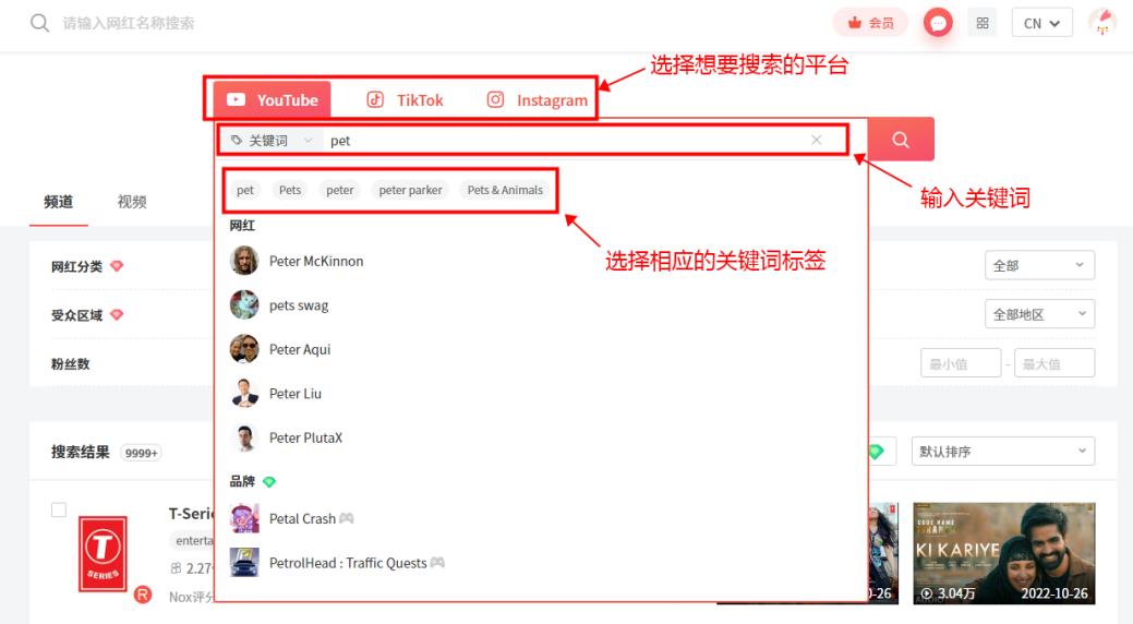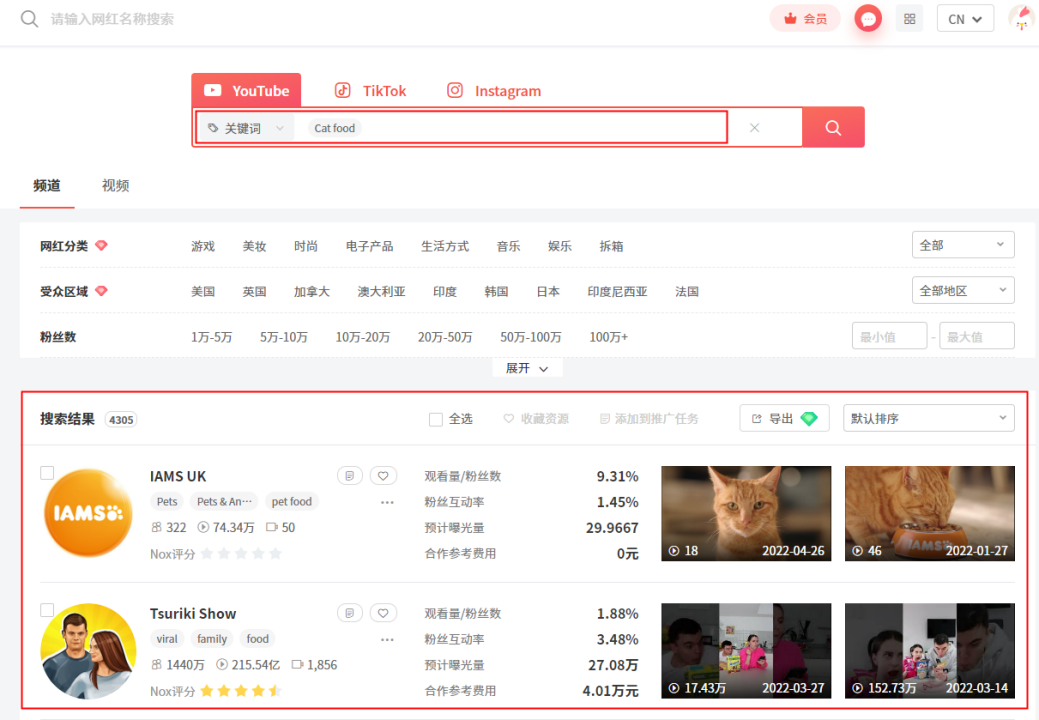 例如:如果一家主营猫咪用品的广告主想要找网红合作,那么除了搜索关键词“pets”外,还可以根据具体网红需求对“pets”关键词进行细化。如“cats”、“cats food”、“cat litter”等。通过搜索细化后的关键词,搜索结果的准确性将得到较大的提升。