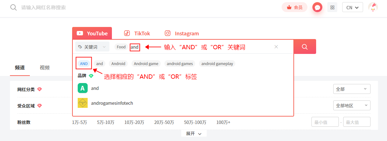 当广告主需要进行多个关键词搜索时,可以在关键词之间加入“AND”标签或“OR”标签,即可进行多关键词交集“AND”和并集“OR”搜索。