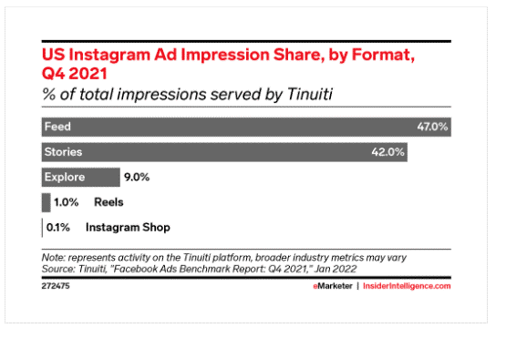 在美国地区,根据第四季度的数据,Instagram广告形式主要以Feed和Stories广告为主,占比分别为47%和42%。