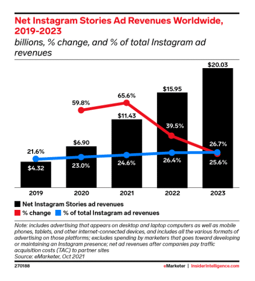 Instagram Story的全球广告收入在2022年将接近160亿美元,这超过了Instagram全部广告收入的四分之一。相比于Instagram 的信息流(Feed)广告,Story广告的增速更快。