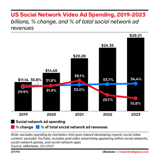 而社媒内容中,以视频内容作为数字营销载体,尤其是以Instagram Stories、Reels、TikTok为代表的短视频,也是一大趋势。据预测,2022年的全球广告主社媒视频广告花费将增长20.1%至243亿美元。