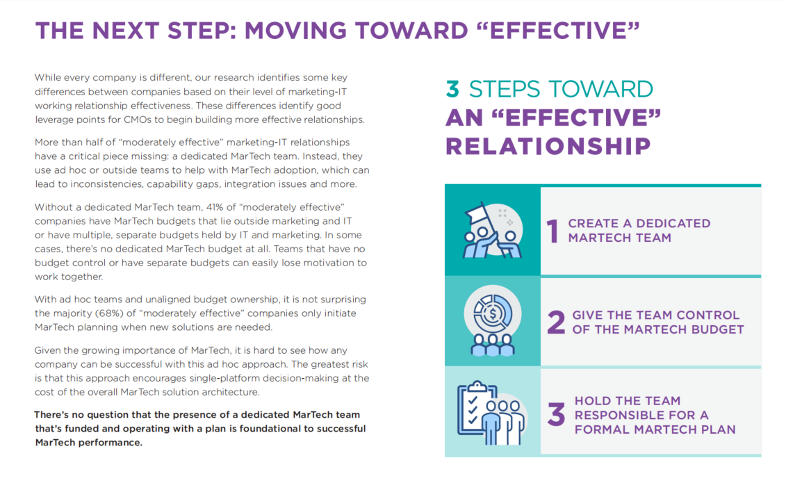 报告也在最后给企业和各位营销专家提出了如何在提高MarTech的在营销活动中的应用效率,优化营销专家和技术方的合作关系。